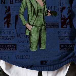 Stylish blue sweater featuring a unique graphic print. Perfect for adding a touch of art to your wardrobe.