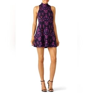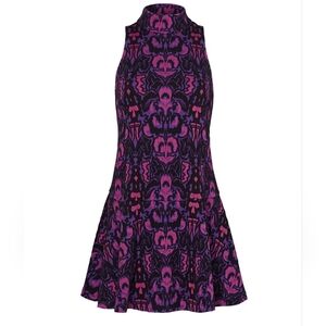 Printed purple knit (54% Cotton, 37 Polyester, 6% Wool, 3% Spandex). Sleeveless. High neckline. Hourglass. Hidden back zipper with hook and eye closure. 35” from shoulder to hem.