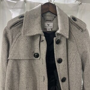 The Worthington Jacket Coat is a stylish women's peacoat in size M made from a wool blend metallic lurex tweed fabric. This mid-length jacket features long sleeves, a button closure, and a classic solid gray color with glitter accents. The coat is lined with polyester and includes a belted collar, pockets, and is designed for casual occasions. The Worthington Industries brand ensures quality and the jacket is perfect for the winter, fall, and spring seasons.
