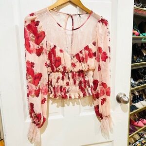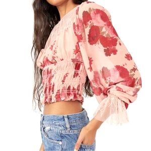 {Free People} "Daphne" Floral Lace Peplum Crop Peasant Blouse