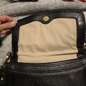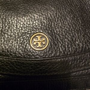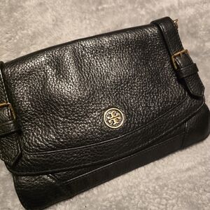 Tory Burch pebble leather black leather crossbody bag with gold logo detail. Perfect for any occasion.