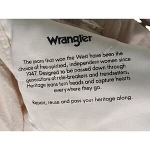 Cream/off-white Wrangler mid rise jeans in a wide leg fit. Soft cotton blend with hemp content. Classic 5-pocket styling, zip fly, copper-tone hardware.