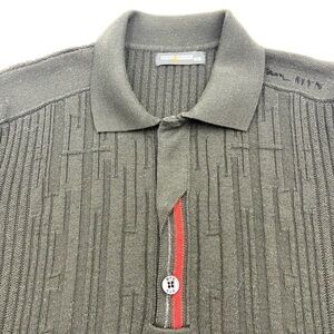 Elevate your wardrobe with this elegant black sweater featuring textured knit and striking red trim. Perfect for a refined and modern look.
