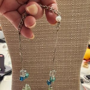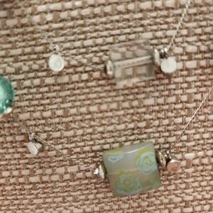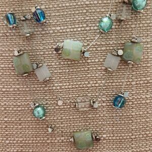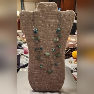 Beautiful teal blues and greens make up this unique necklace. Definitely a statement piece!