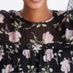 Printed shadow stripe silk tunic dress. Rose print over crinkled silk georgette, ruffle trim, drop shoulder, flared sleeve, back keyhole button closure & oversize fit. 100% silk georgette. We recommend sizing down in this style.