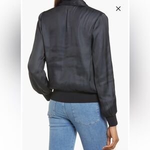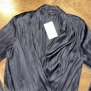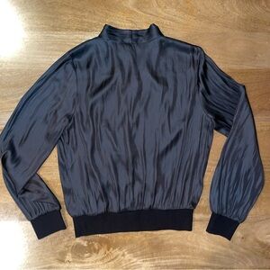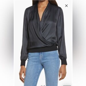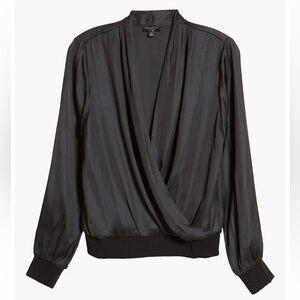 A drapey surplice blouse shaped from lustrous satin is finished with ribbed trim for comfort and textural contrast.