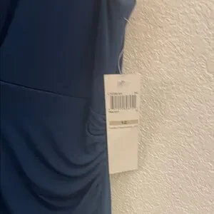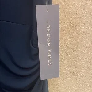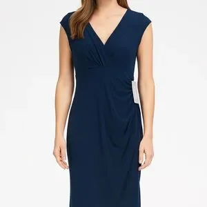 This gorgeous deep blue midi dress by London Times will become your new favorite. It has a flattering draped v-neck neckline and tucking in the side to provide a comfortable fitted look. It has a side slit. Its ideal for both casual and formal events. It’s new with tags in a women’s size 12.