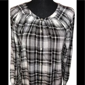 Loft Plaid Button Down Blouse. Black and white plaid button front blouse. Long sleeve with button cuff. Collarless. Side hem slits. 75% rayon/25% linen. Size: small. NWT.