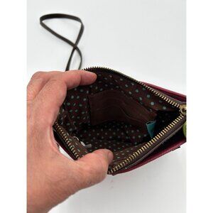 Lining: Brown polka-dot fabric interior with zipper pocket & card slots