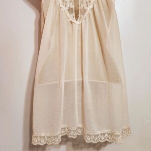 Chic cream-colored blouse with delicate lace details. Flattering sheer lace mixed media top with shirred front and back detail.