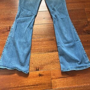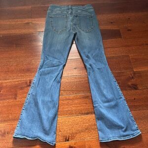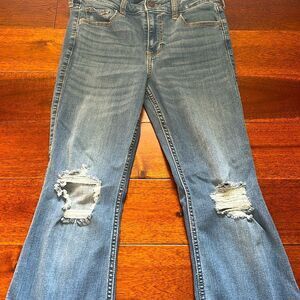 Stylish distressed blue flare jeans perfect for a casual look. Comfortable and trendy, these jeans are a must-have for your wardrobe.