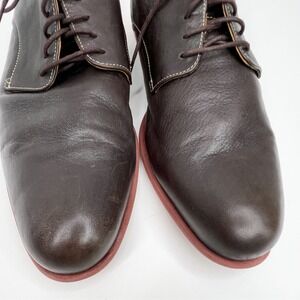 Cole Haan dress shoes featuring a sleek silhouette with classic lace-up detailing and subtle stitching accents. Contrasting brick red sole. Shoes show minimal signs of wear. Please see pictures.