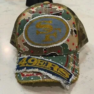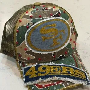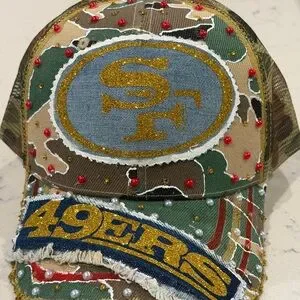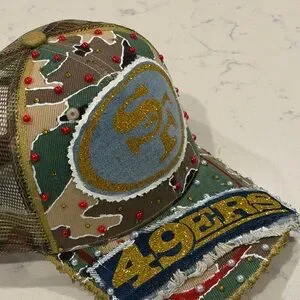 Stylish camouflage cap featuring a gold 49ers logo. Embellished with red and white accents.