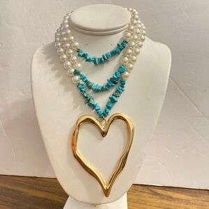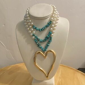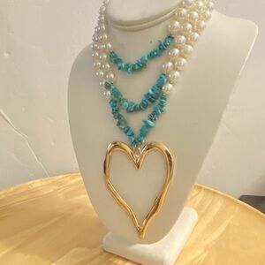 This stunning necklace features elegant pearls and vibrant turquoise stones, beautifully complemented by a gold heart pendant. Perfect for adding a touch of sophistication to any outfit.
