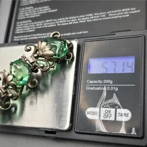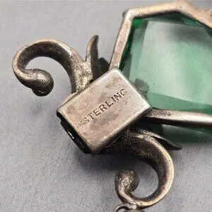 Vintage Art Nouveau sterling silver demi-parure featuring a 7.25" bracelet and 1" drop earrings. Ornate floral metalwork cradles faceted green glass stones in a sculptural bezel setting. Both pieces marked “STERLING,” no maker’s mark. Total weight: 57.14g. A romantic, nature-inspired set with flowing lines and turn-of-century charm. Gifted with love, now ready to enchant a new wearer.