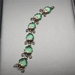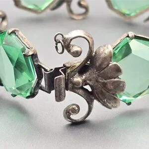 Art Nouveau Sterling Silver Demi-Parure Green Glass Floral Bracelet Earrings