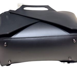 This bag is so special and so unique. Meet the Mila bag by Santo Couture Milano. This sample bag is made of beautiful heavy smooth leather from Italy. The bag features leather from the top of the bag on the handles all the way to the bottom of the bag. These beautiful leather pieces wrap in a design to form a triangle shape on the front and back of the bag. Has 4 metal feet. Bag also has an added feature which includes a special detachable zipper pouch which clips in and rests in the interior. Bag includes a special card with the piece number. Price is firm.