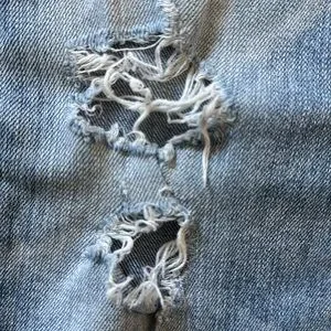 Trendy light blue jeans with a relaxed fit. Features stylish distressed accents.