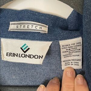 Erin London vintage funky jean jacket with super detailed baroque tapestry panels featuring a seaside scene, with charming houses and a table set for tea. There are so many fun details. The brown piping and gold stitching, and buttons with tiny horses (I think) add maximum flair. This jacket has two pockets. The blue denim does have a bit of stretch. This piece is a size medium, but would also fit a small. This jacket is so unique and would be a dream to style. It would work well in a boho, cottagecore, or vintage fit to name a few. It is in excellent condition with no known flaws.