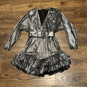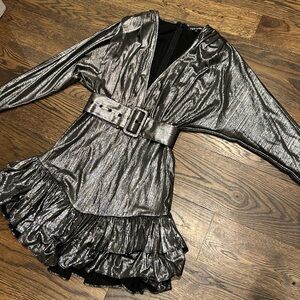 Retrofete Maureen Metallic Silver Mini Dress. Long sleeve, deep front V, rear zipper, removable belt, shoulder pads and ruffle skirt. Size small. Laying flat approximate measurements are 21" chest, 13" waist & 33" length. Worn one time for New Year's Eve. Like new condition!!