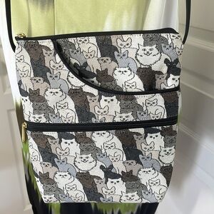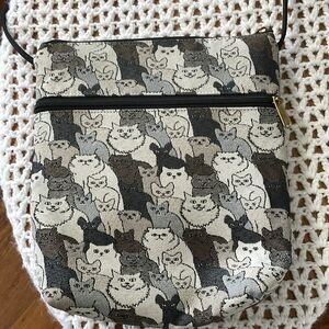 Thin shoulder strap and a woven material with a print of cats and kittens. Versatile handbag any cat lover would adore. Meow!