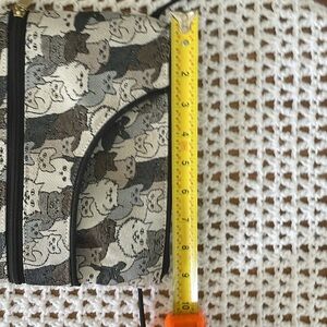 Danny K cat kitten purse in gray, black and white. Slip pocket and zip pocket on one side and zip pocket on back. Zip pocket inside purse as well. All zippers function as they should on this bag. Made in USA.