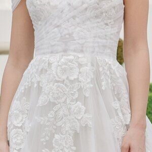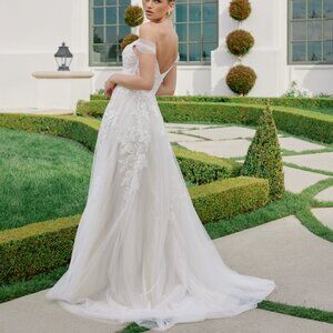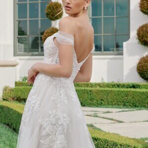 TULLE MATERIAL FLORAL APPLIQUE OFF SHOULDER A-LINE BRIDAL DRESS WITH SLIT AND V BACK WITH ZIPPER