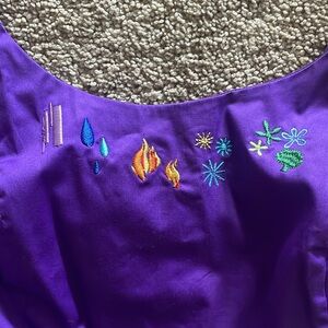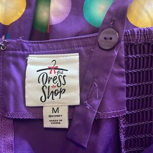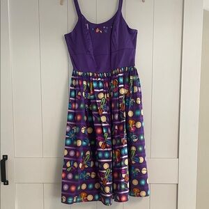 Charming Disney midi dress. Features vibrant purple top. Skirt adorned with colorful patterns. Perfect for any occasion.