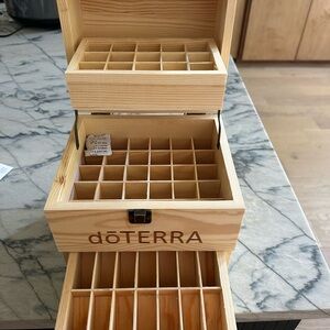New, never used - Elegant wooden box with doTERRA logo. Features brass latch and handle.