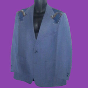 This awesome Belk Manstyle blazer is size 46 L. It is light blue polyester with custom denim shoulder patches. In good, gently-used condition. Make it yours today.