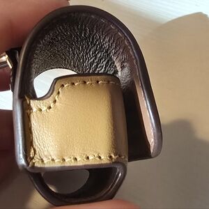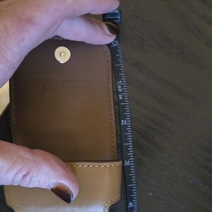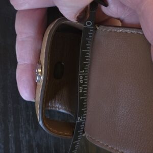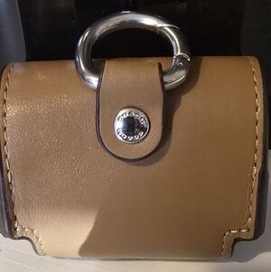 Stylish Coach Earbuds pouch in tan leather. Features a sleek silver button detail.
