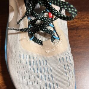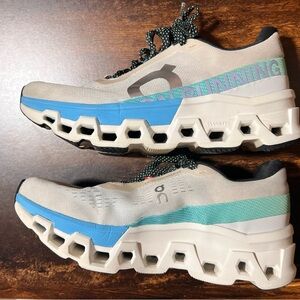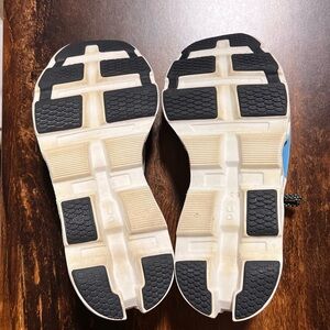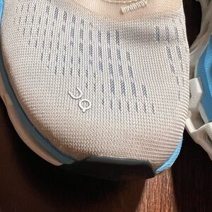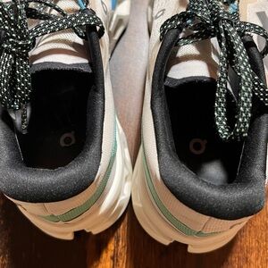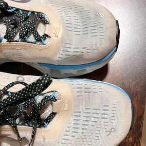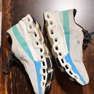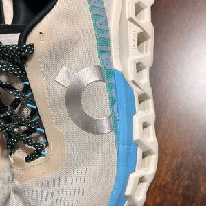 Stylish On Clouds sneakers. Features cream upper with blue and green accents. Comfortable and durable design. Like new.