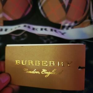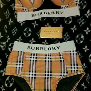 Elegant Burberry intimates set with signature checkered pattern. Features tan, black, and white with red accents. the bottoms are cheeky as well as high waisted. The top is a push up with adjustable strap. Truly a beautiful set : )