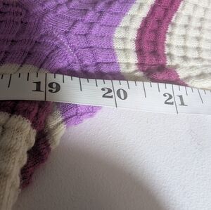 Stay cozy and stylish with this striped V-neck pre-loved sweater dress. Featuring a blend of cream, purple, and green colors, it's perfect for any casual outing. Chest measures 20 inches from pit to pit. Length measures 34 inches from shoulder to hem. Material is 56% cotton 27% Nylon