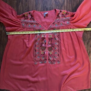 Womens Embroidered Top Blouse Boho Tunic Coral Pink Balloon Sleeve Size L XL