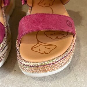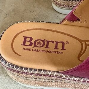 Born size 9 raspberry dark pink platform wedge leather slip on sandals with floral design. 2.5 inch platform. Comfortable footbed. Minimal signs of wear. Scuff on one strap. Please refer to picture. Raised floral design. Great for vacation.