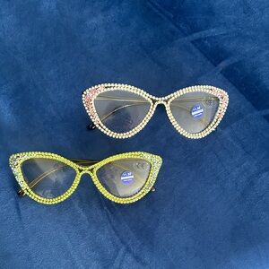 Glamorous Rhinestone Sunglasses - Green and Pink Set of Reading Glasses +1.50