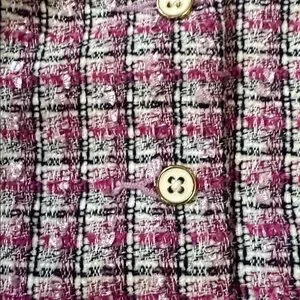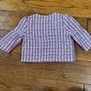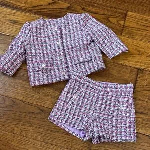 Chic tweed jacket and shorts set in pink and white. Features button details and a stylish design. Jacket is a 2 and shorts are 18/24 with an adjustable waist and side zipper
