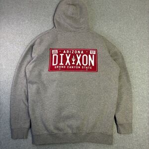 Mens Dixxon Flannel Company zip-up hoodie in gray, size Large. Features a front Arizona state patch with DXXON branding and a large back graphic styled like an Arizona license plate reading Dixxon Grand Canyon State. Heavy, soft fleece interior with classic Dixxon quality and fit.