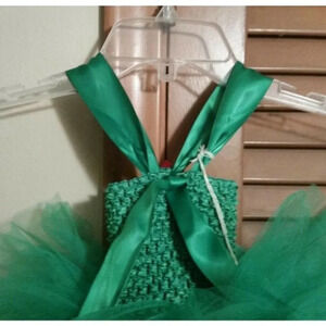 Handmade Green TuTu Dress. It features a crocheted top with matching green ribbon for straps, option of tying into a bow in the back with beautiful netted/tule skirting. It also features a green & red ribbon tied design on the front of the dress.