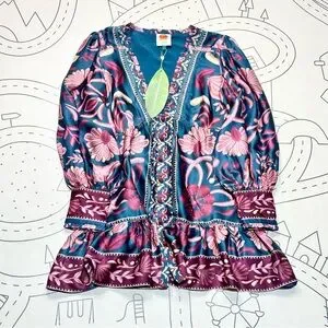Stylish floral dress with a deep V-neck. Features a mix of teal and pink patterns. Perfect for casual outings.
