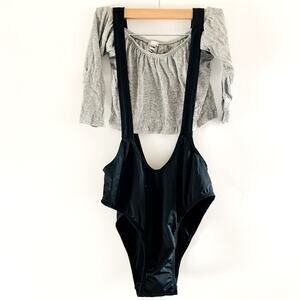 Come on ladies! You ready to make your body talk? Slip into a deep stretch in this exclusive Let's Get Into Physical costume featuring a grey crop top with an off-the-shoulder neckline, 3/4 length sleeves, black romper shorts with suspender straps, a high cut leg and cheeky cut back.