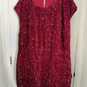 Dazzle in this chic ruby red mini dress. Perfect for a night out. Features a shimmering design.