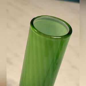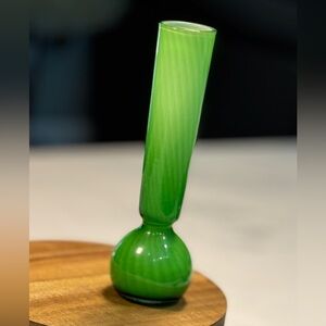 Midcentury Green Art Glass Swirled Vase. Cased art glass. Hand blown glossy finish. Measures 7.75” tall. Pre-owned but in excellent condition. No chips or cracks. Such a beautiful piece.