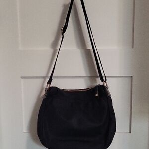 Used condition. This is a great bag and very versatile! sporty/chic vibe. Cleaned and still in great condition! Slim profile but holds alot of stuff!! Only flaw is the edges of the glue that hold the strap have some of the black paint that rubbed off (shown in photos)