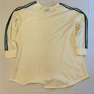 Cream sweatshirt with colorful stripes on sleeves. Ideal for casual wear. Very soft and cozy. A perfect addition to any wardrobe. No rips, holes, strains or flaws. Ships fast.