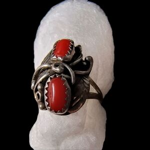 This beautiful coral ring is sized for a child or smaller adult finger. It features 2 rich red coral cabochons set in a sterling silver sawtooth setting with a traditional Native American leaf and tendril setting.