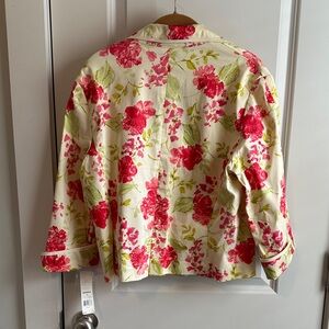 Chic floral blazer with vibrant red flowers. Cream background enhances the design. Perfect for stylish outings. Unlined crop 3 button jacket. 17” sleeve with cuff, about 18 inches across chest and 21” length from shoulder to bottom. New with tags.