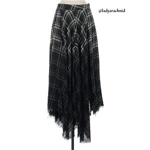 Current Mood Model Approved Maxi Skirt - for that effortless kind of edge. This low-rise maxi skirt has a non-stretch woven construction, an ombre plaid print, a back zip closure, and a frayed raw edge handkerchief hem. Measures about 14" across the waist and 41" waist to the longest point of the hem. Overall excellent condition with no major flaws, however the fabric/care tag has been cut out. Per the website the fabric is 100% viscose and best to hand wash cold/line dry. Feel free to ask any questions. Smoke free home but we do have pets. BIN26