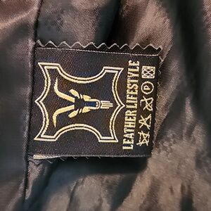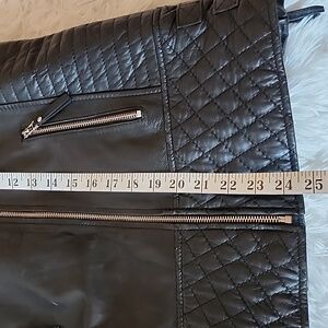 Stylish black leather jacket featuring quilted details and multiple zippered pockets. Perfect for a chic and edgy look. Pre-owned Good Condition